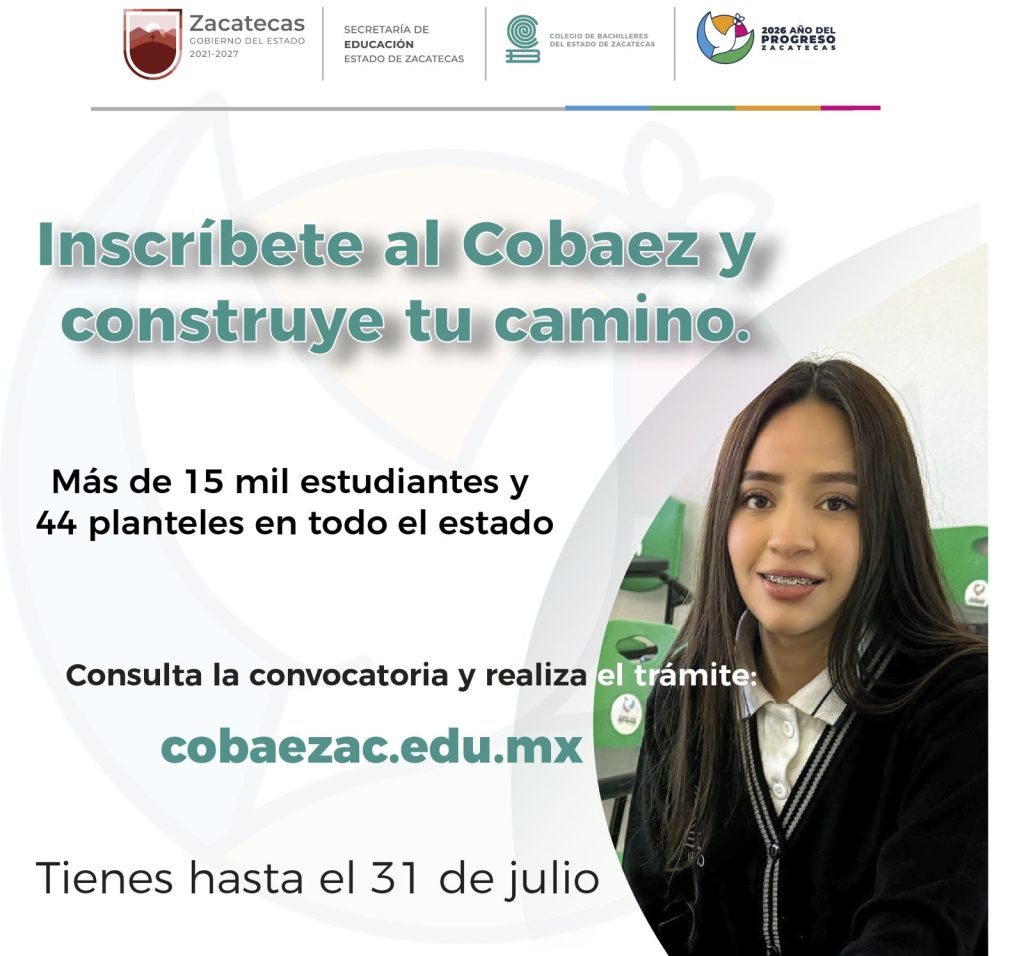 Zacatecas, Zac.- En el marco del 2026, Año del Progreso en Zacatecas, el Colegio de Bachilleres del Estado de Zacatecas (Cobaez) publicó la convocatoria de nuevo ingreso para el ciclo escolar 2026–2027, dirigida a jóvenes que hayan concluido o se encuentren cursando el tercer grado de secundaria y deseen continuar sus estudios de Educación Media Superior, en cualquiera de sus 40 planteles y cuatro extensiones en el estado.