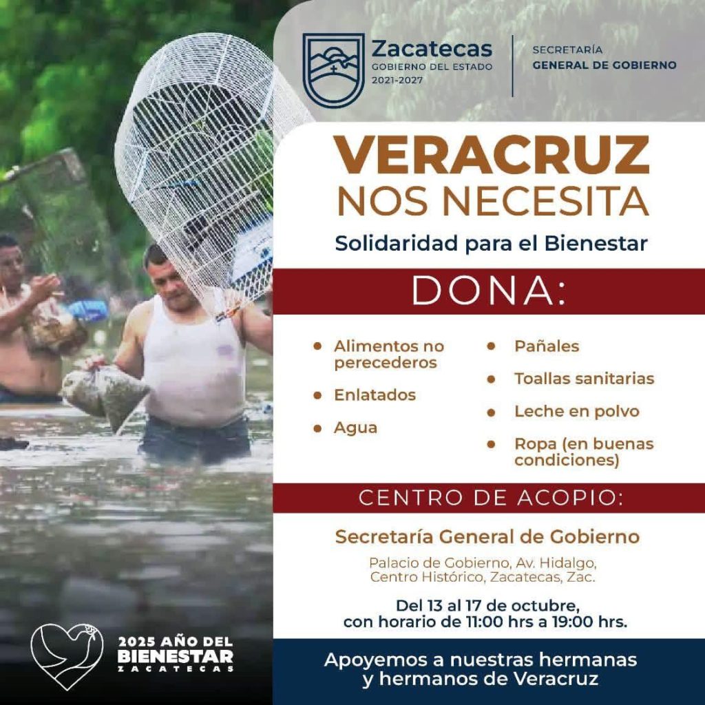 Zacatecas, Zac.- El Gobierno de Zacatecas, que encabeza el mandatario estatal David Monreal Ávila, a través de la Secretaría General de Gobierno, llamó a la población a solidarizarse con las familias afectadas por las lluvias, principalmente del estado de Veracruz.