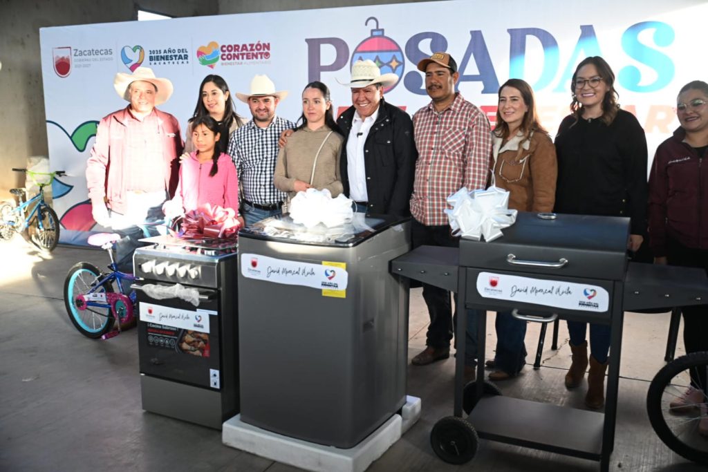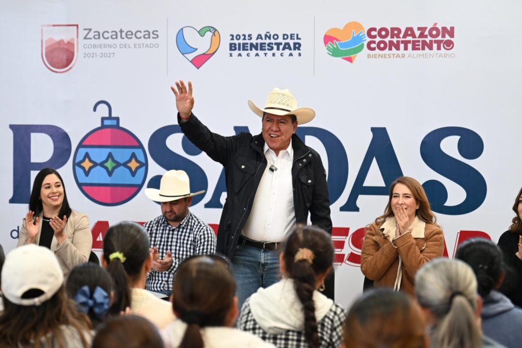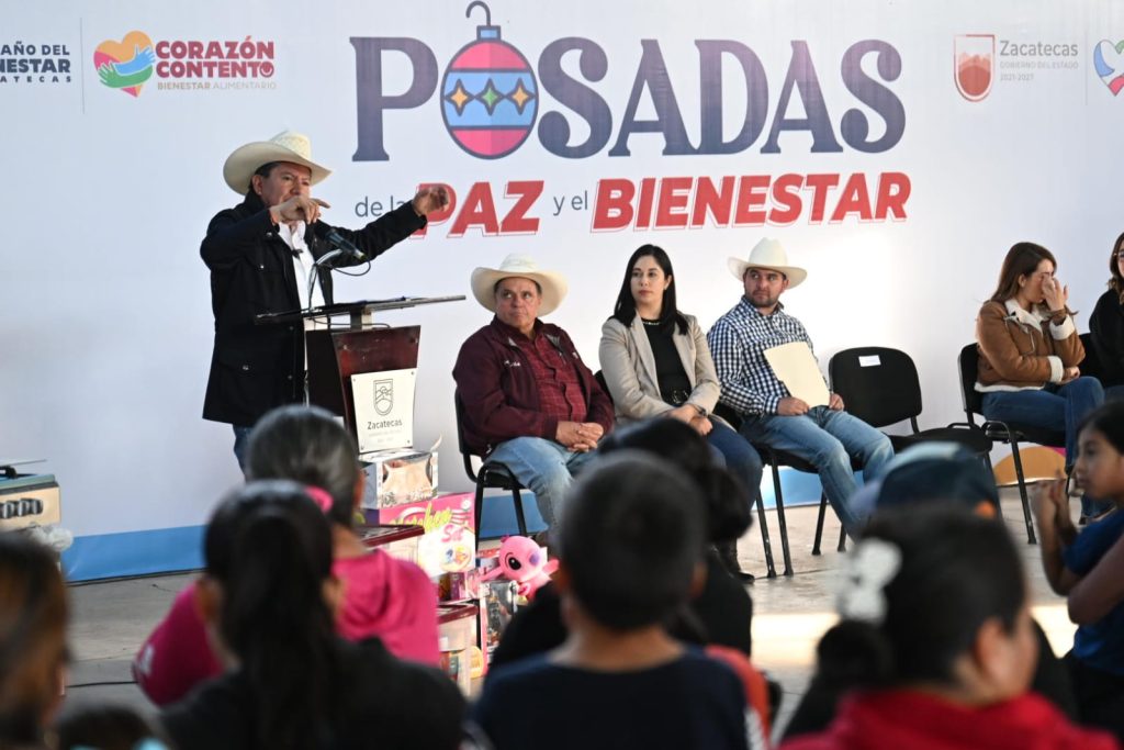 Florencia de Benito Juárez, Zac.- Con el arranque anticipado de las posadas navideñas en las comunidades de San Lucas Tepetitlán y Potrerillos, del municipio de Florencia de Benito Juárez, el Gobernador David Monreal Ávila refrendó el compromiso con las familias del campo zacatecano al hacer entrega de apoyos alimentarios, juguetes, enseres domésticos y proyectos de autoconsumo.