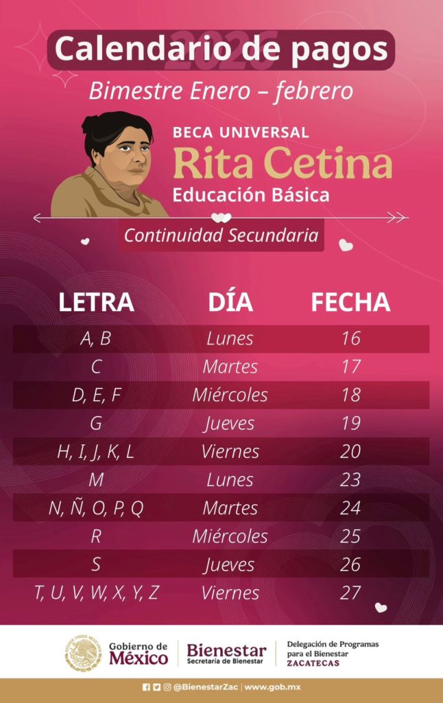 Zacatecas, Zac., 16 de febrero de 2026.- Ofelia Reyes Hernández, titular de la Coordinación de Becas para el Bienestar en Zacatecas, informó que ya se encuentra publicado el calendario oficial de pagos por letra para las y los becarios de secundaria de continuidad de la Beca “Rita Cetina”, el cual puede consultarse únicamente a través de la página web oficial y las redes sociales verificadas de Programas y Becas para el Bienestar.