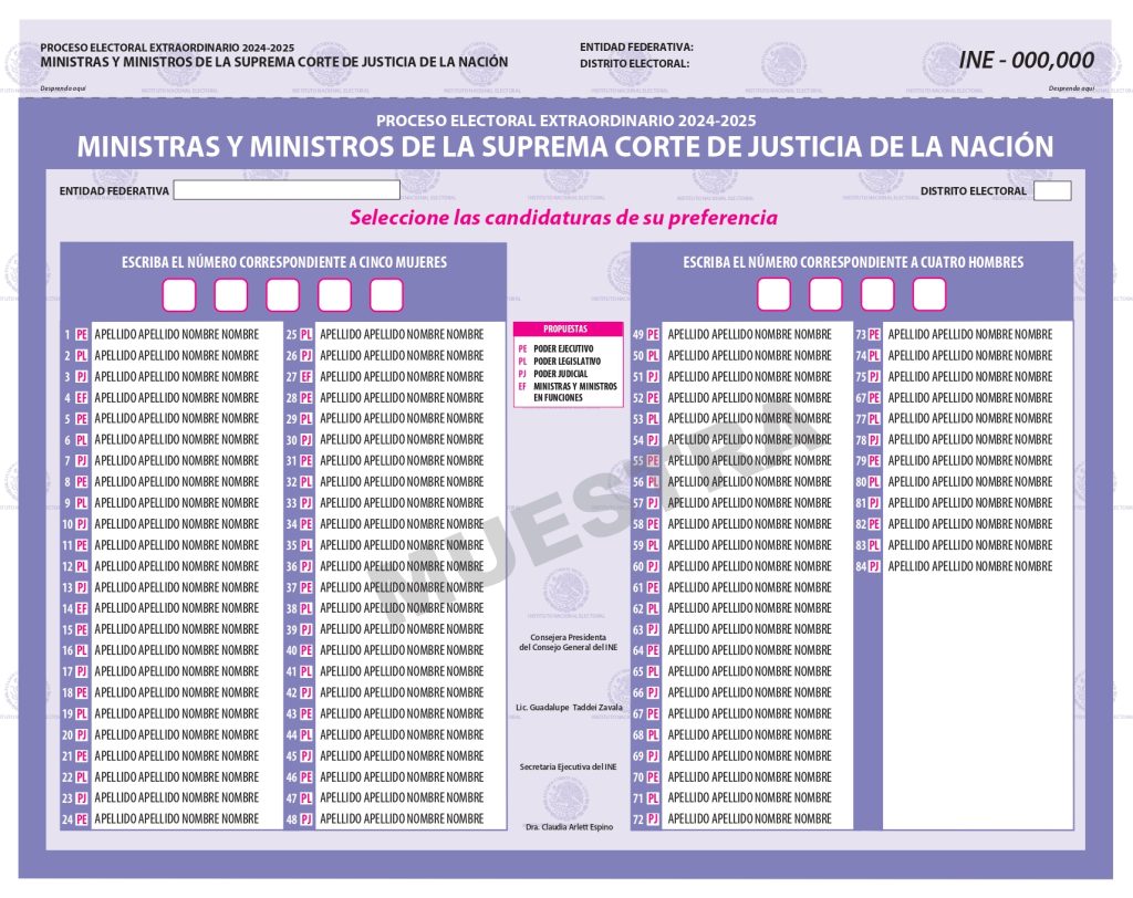 En una primera etapa, se imprimirán las boletas para la elección de los cargos de la Suprema Corte de Justicia de la Nación (SCJN) y la Sala Superior del Tribunal Electoral del Poder Judicial de la Federación (TEPJF) y, posteriormente, para magistraturas de las salas regionales del TEPJF; integrantes del Tribunal de Disciplina Judicial, así como magistraturas de circuito y personas juzgadoras de distrito.