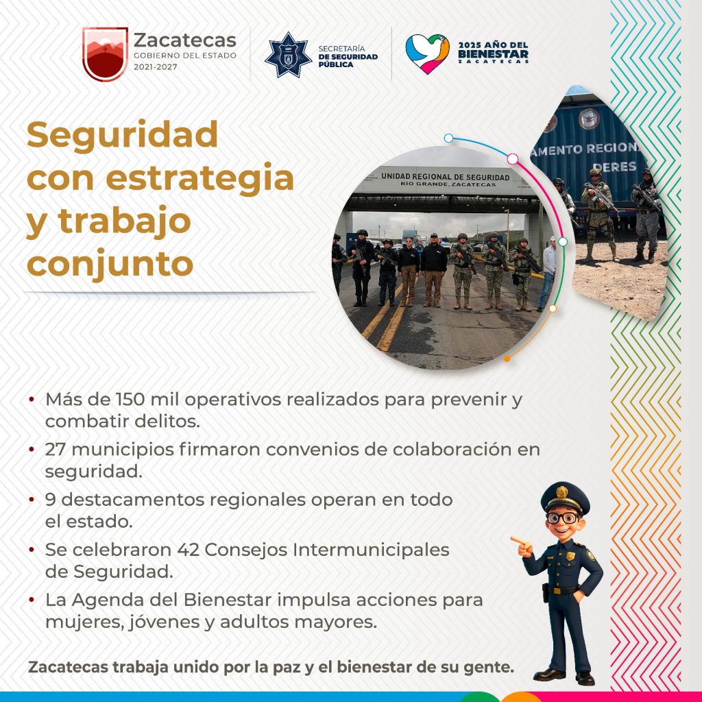 “Hoy, Zacatecas se consolida como un estado en paz y con oportunidades. La transformación en materia de seguridad es posible cuando se trabaja con unidad, responsabilidad y compromiso. Ni un paso atrás en la lucha por la seguridad y el bienestar de las y los zacatecanos”, puntualizó el funcionario estatal.