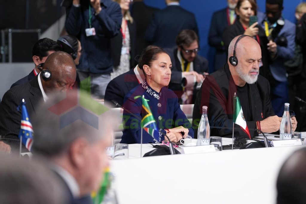 En su participación, la Presidenta está acompañada por el secretario de Relaciones Exteriores, Roberto Velasco Álvarez; la secretaria de Medio Ambiente y Recursos Naturales, Alicia Bárcena Ibarra; el jefe de la Oficina de la Presidencia de la República, Lázaro Cárdenas Batel, y el embajador de México en España, Quirino Ordaz Coppel.