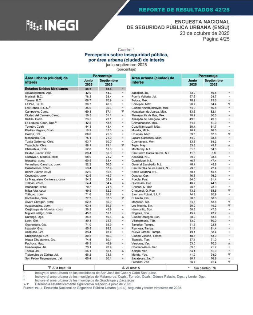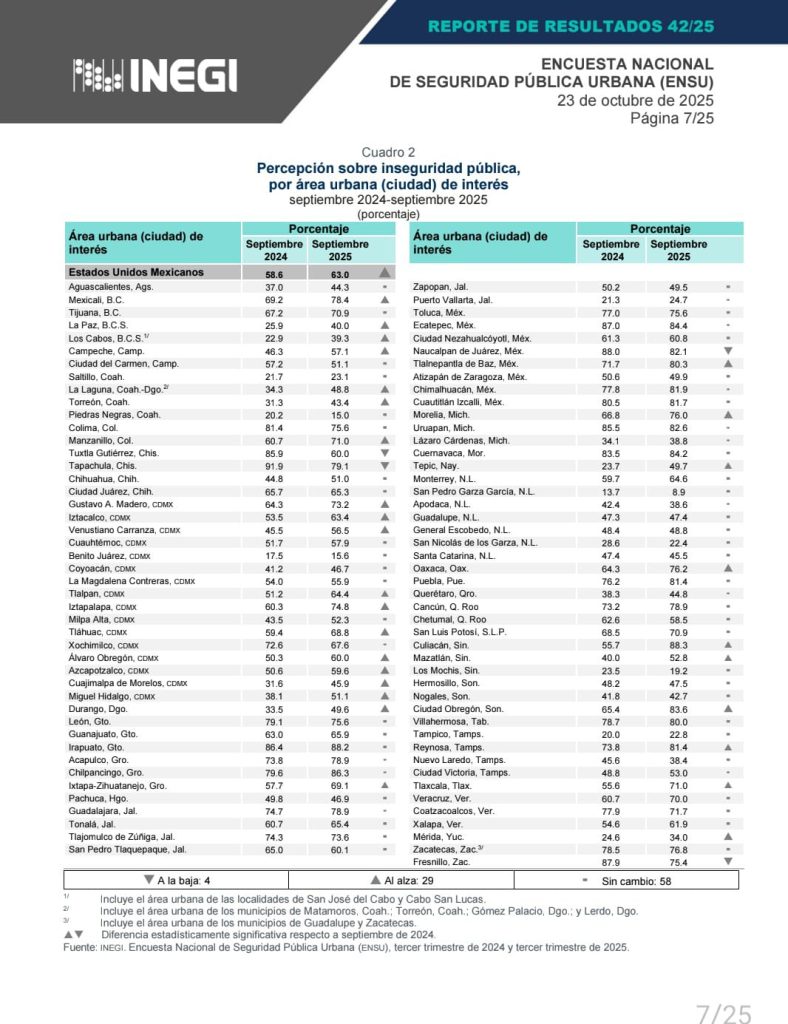 A nivel nacional, la percepción de inseguridad se ubicó en 63.0 por ciento, entre la población de 18 años de edad y más, residente en las 91 áreas urbanas de interés, lo que representa un cambio estadísticamente significativo, comparado con el 58.6 por ciento registrado en septiembre de 2024.