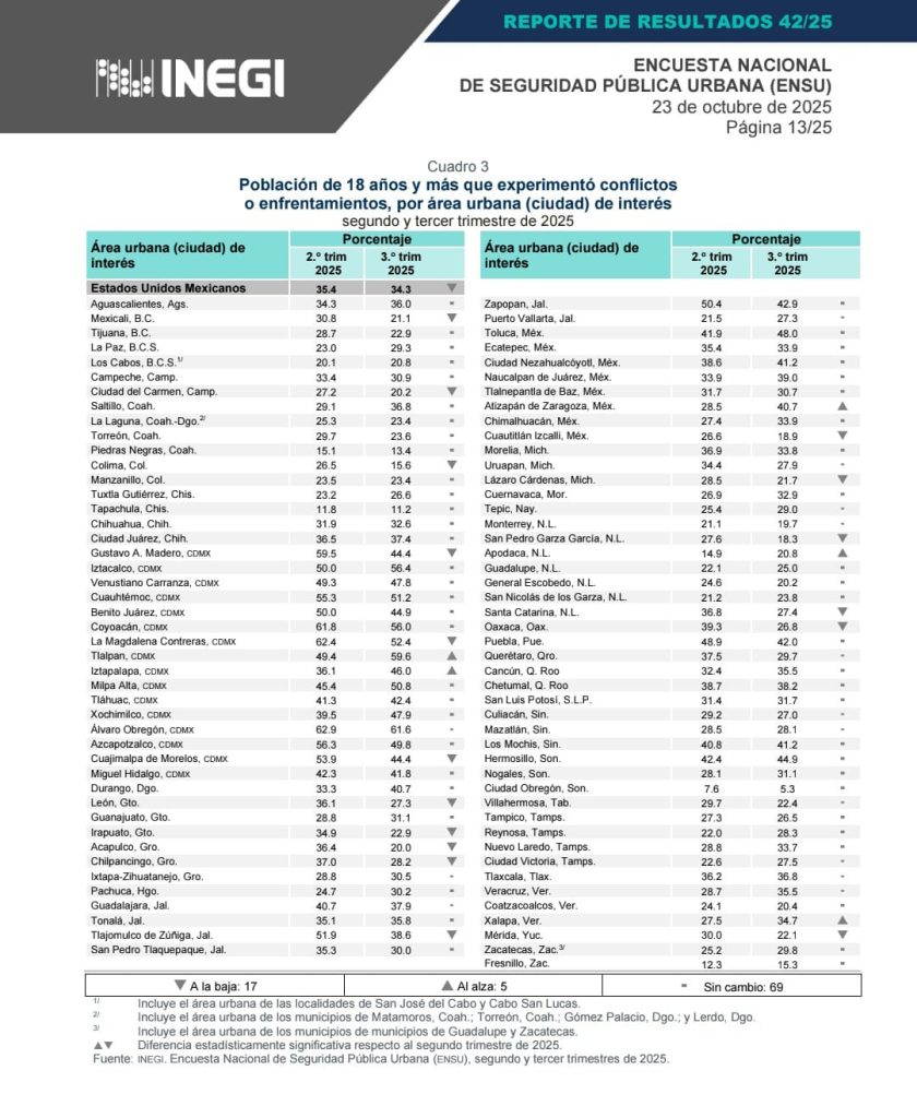 Zacatecas, Zac., 23 de octubre de 2025.- La Encuesta Nacional de Seguridad Pública Urbana (ENSU), elaborada por el Instituto Nacional de Estadística y Geografía (INEGI), reportó que Zacatecas y Fresnillo continúan a la baja en la percepción de inseguridad; la capital ha descendido hasta el lugar 20 a nivel nacional y el Mineral hasta el 26, con una disminución anual de 12.5 puntos porcentuales.