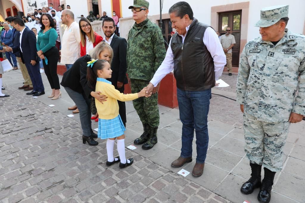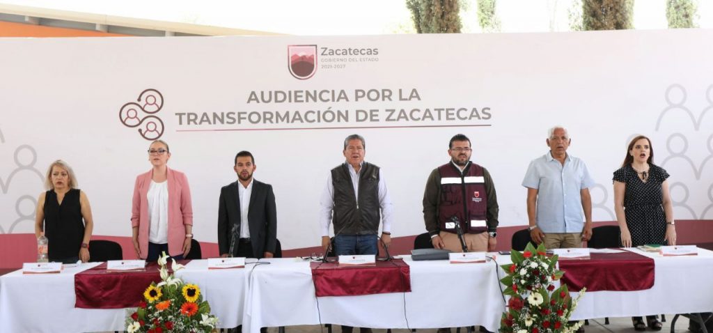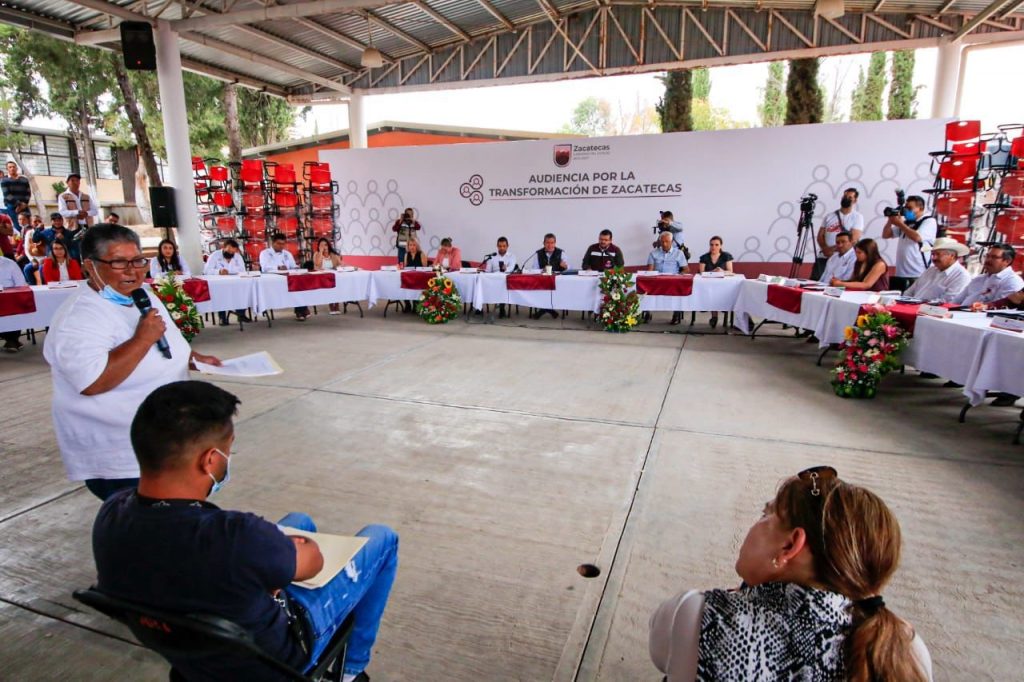 Luego de la ceremonia de honores a la bandera en el jardín principal y de la reunión itinerante de la Mesa de Construcción de Paz sostenida con los presidentes municipales de la región, el mandatario estatal encabezó la Audiencia por la Transformación con la población del Pueblo Mágico de Pinos.