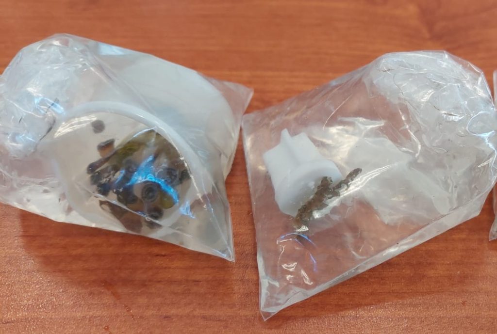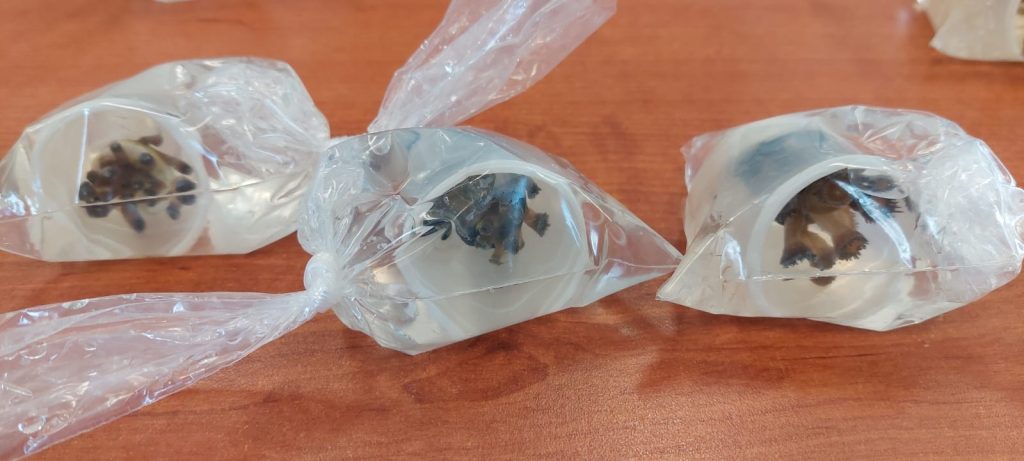 Dentro de la caja de cartón cubierta con hule, se encontraron 20 bolsas de plástico transparente con agua y piezas de coral marino vivo, especie regulada bajo la norma NOM-059-SEMARNAT-2010, que la ubica en la categoría de especies “Sujetas a Protección Especial”.