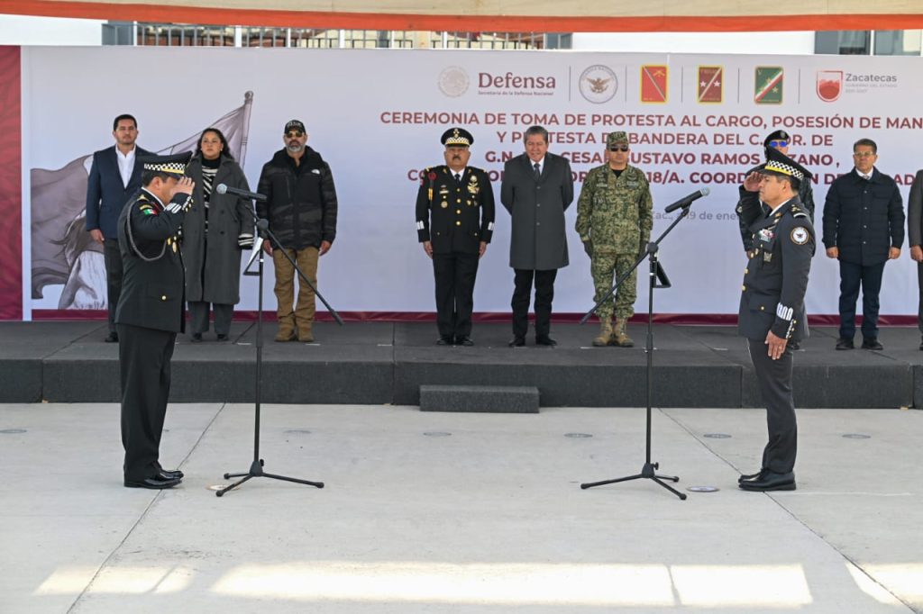 El Coordinador Estatal de la Guardia Nacional en Zacatecas, Vicente Dimayuga Canales, fue el encargado de tomar protesta al Coronel Ramos Lozano, conforme al artículo 177 del Reglamento del Ceremonial Militar.