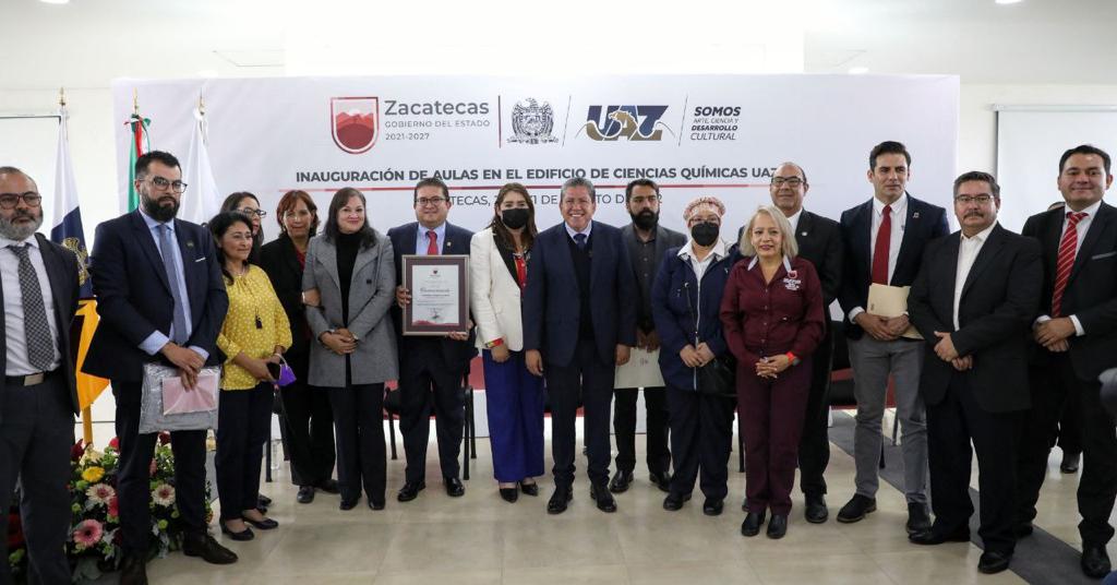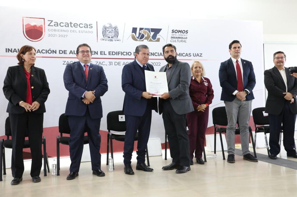 En ese sentido, este día, entregó un aula magna, servicios sanitarios, el estacionamiento, banqueta de conexión, red eléctrica e hidráulica del edificio E-5 que alberga a distintas licenciaturas y posgrados del área de químicas. Acciones en las que el Gobierno de Zacatecas, en coordinación con el de México, invirtió 19.1 millones de pesos.