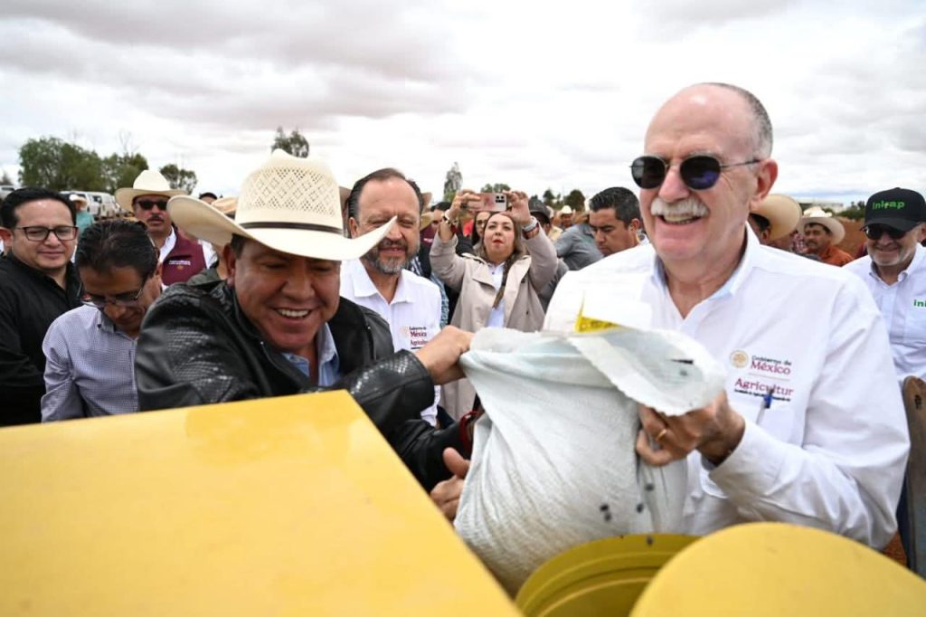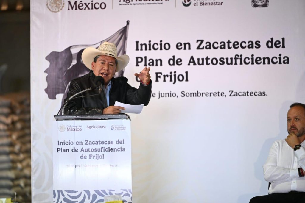 El Secretario de Agricultura y Desarrollo Rural, Julio Berdegué Sacristán, destacó que, con la entrega de 5 mil 700 toneladas de semilla certificada para 230 mil hectáreas, fertilizante gratuito, crédito accesible, seguro agropecuario y comercialización directa, el programa busca producir 1 millón 200 mil toneladas de frijol en México, lo que consolidará a Zacatecas como pilar de la soberanía alimentaria.