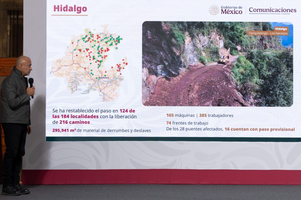 Ciudad de México.- El Gobierno de México informó que, la Secretaría de Infraestructura, Comunicaciones y Transportes (SICT) ha restablecido el paso en 202 localidades de un total de 288, con la liberación de 360 caminos de la Red Estatal y Caminos Alimentadores en Veracruz, Puebla, Hidalgo, Querétaro y San Luis Potosí y al 23 de octubre, la Secretaría de Bienestar ha entregado, a 13 días del fenómeno meteorológico, 36 mil 358 apoyos de 20 mil pesos, así como dos vales de despensa y uno de enseres, a personas afectadas por las lluvias extraordinarias en Veracruz, Puebla, Querétaro y San Luis Potosí.