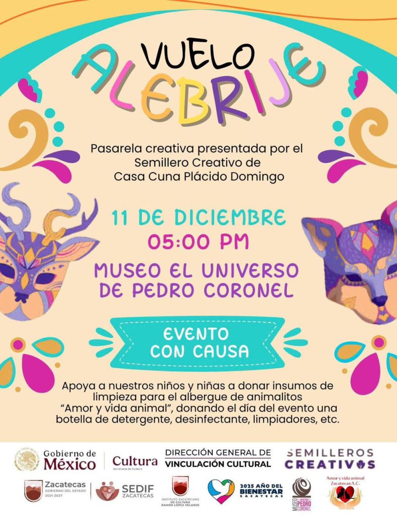 Zacatecas, Zac.- El Gobierno de Zacatecas, encabezado por el mandatario estatal David Monreal Ávila, llevará a cabo el evento “Vuelo Alebrije”, pasarela creativa protagonizada por niñas y niños del Semillero Creativo de Casa Cuna “Plácido Domingo”.