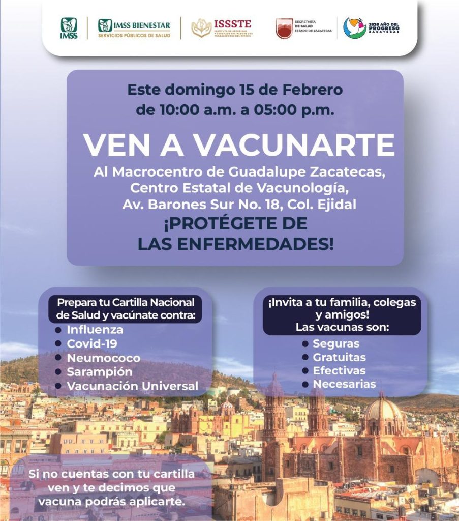 Zacatecas, Zac., 13 de febrero de 2026.- Como parte de la Agenda del Progreso y con el propósito de que la totalidad de las zacatecanas y zacatecanos completen su esquema de vacunación, la administración estatal, encabezada por el Gobernador David Monreal Ávila, por medio de la Secretaría de Salud (SSZ), lleva a cabo una estrategia, a través de la cual se instalarán tres macrocentros, este domingo 15 de febrero, en los municipios de Guadalupe, Fresnillo y Ojocaliente.