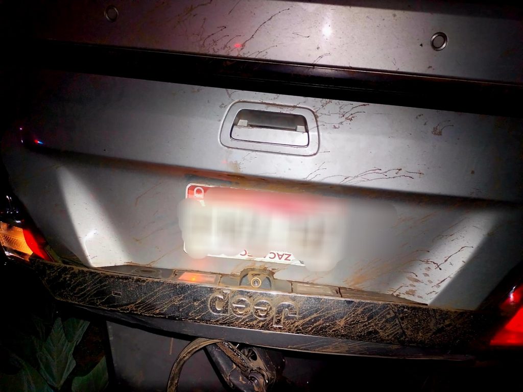 A aproximadamente 25 metros de los cuerpos, fue localizado un vehículo tipo SUV, marca Jeep Grand Cherokee, color gris, con placas de circulación del estado de Zacatecas. No se encontraron identificaciones ni pertenencias que permitieran determinar de inmediato la identidad de los fallecidos.