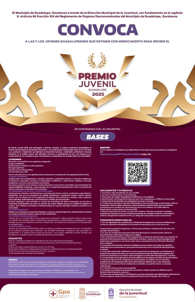 Guadalupe, Zac.- Con la finalidad de incentivar la participación de los jóvenes guadalupenses, el Gobierno de Pepe Saldívar a través de la Dirección de la Juventud, convoca a participar en el premio juvenil 2025.