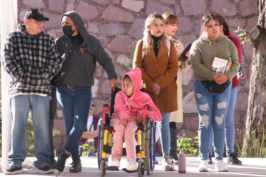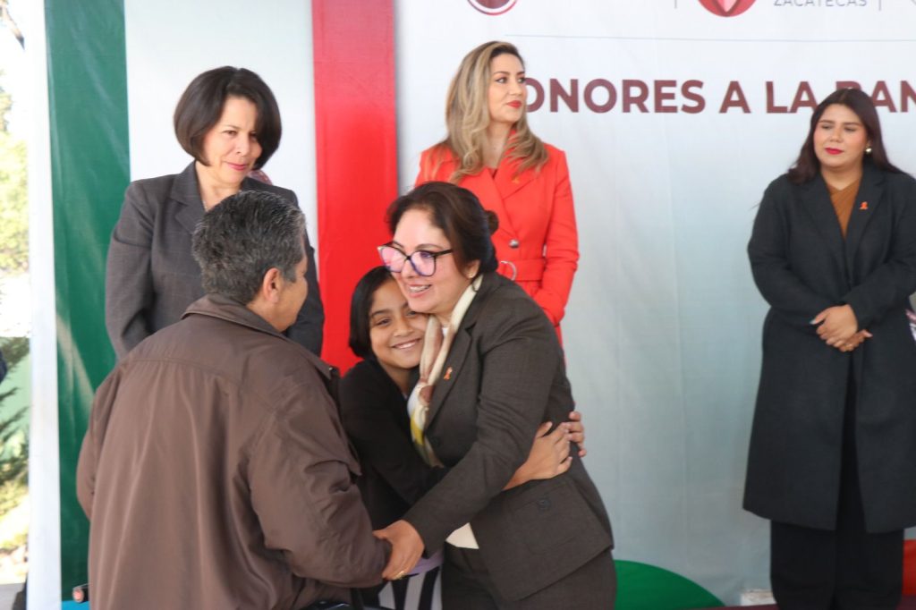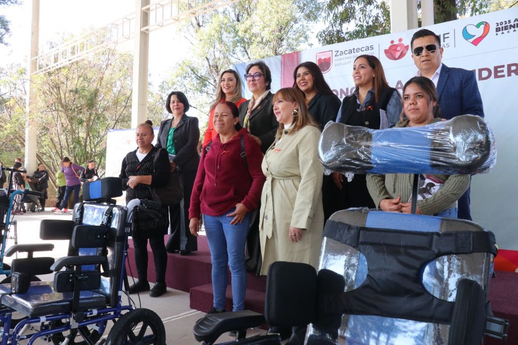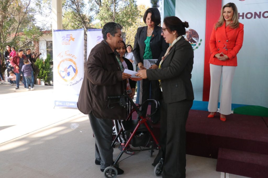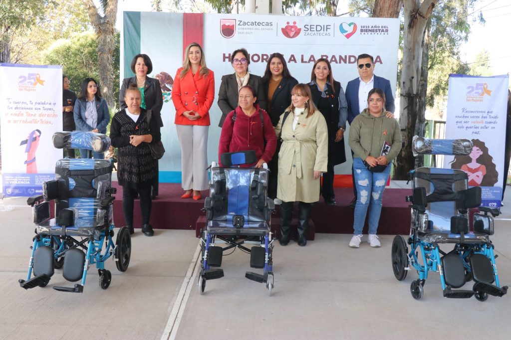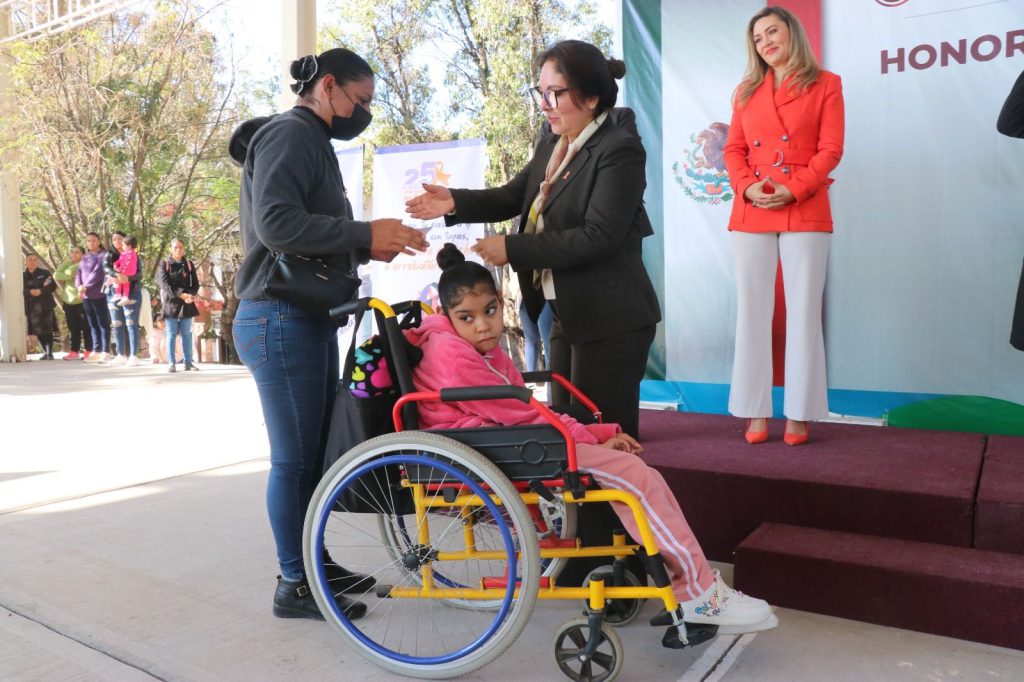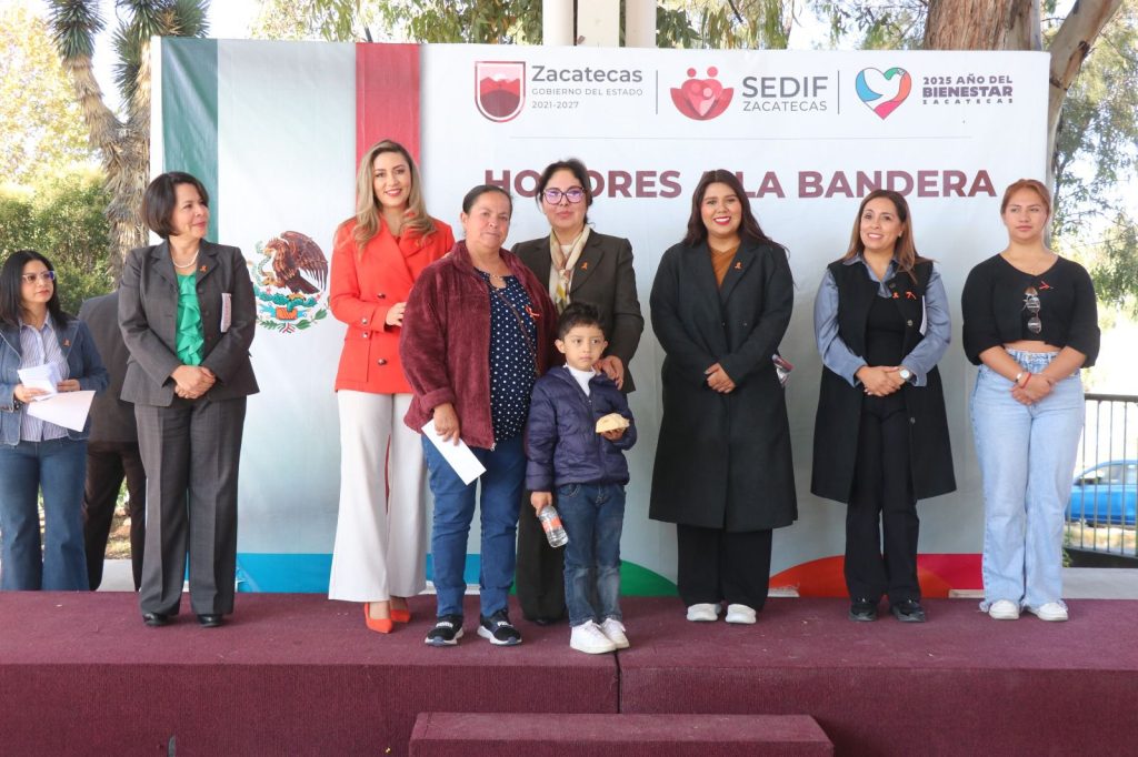 Tras la realización del acto cívico de Honores a la Bandera, la Presidenta Honorífica del Sistema Estatal para el Desarrollo Integral de la Familia (SEDIF), Sara Hernández de Monreal, encabezó la entrega de sillas de ruedas especializadas para personas con parálisis cerebral infantil, así como apoyos económicos destinados a respaldar a hogares que enfrentan condiciones de vulnerabilidad.