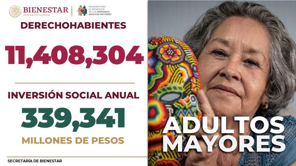 En el Salón de la Tesorería de Palacio Nacional, la secretaria de Bienestar reportó que 11 millones 408 mil 304 derechohabientes de la Pensión para el Bienestar de las Personas Adultas Mayores reciben el pago de este derecho constitucional, con inversión social anual de 339 mil 341 millones de pesos. La pensión es de cuatro mil 800 pesos bimestrales.