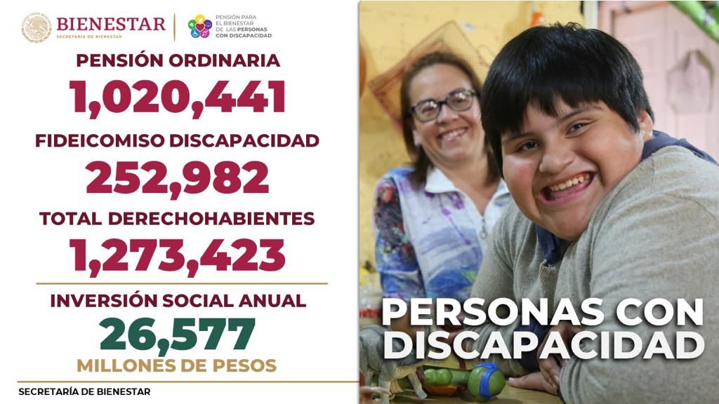 Añadió que un millón 273 mil 423 derechohabientes de la Pensión para el Bienestar de las Personas con Discapacidad reciben pensión bimestral; de ellos, un millón 020 mil 441 reciben la pensión ordinaria y 252 mil 982 reciben este derecho a través del fideicomiso discapacidad, con la concurrencia de recursos del Gobierno de México y los estados; en ambos casos, la inversión social anual es de 26 mil 577 millones de pesos. La pensión es de dos mil 950 pesos bimestrales.