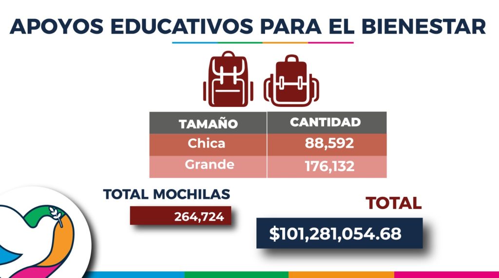 ▪️Se destinaron 101 millones 281 mil 054 pesos para la entrega de 264 mil 724 mochilas a todos los estudiantes de Educación Básica