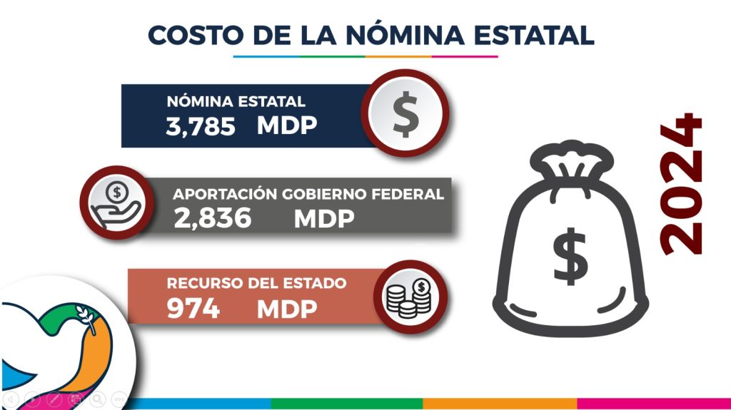 Actualmente, el costo de la nómina estatal asciende a un total de 3 mil 700 millones de pesos, por lo que, gracias a las contribuciones de la Federación, el déficit económico es de 1 mil 200 millones de pesos, lo que permite a la administración central del Gobernador David Monreal Ávila invertir recursos en temas prioritarios como salud, seguridad y campo.