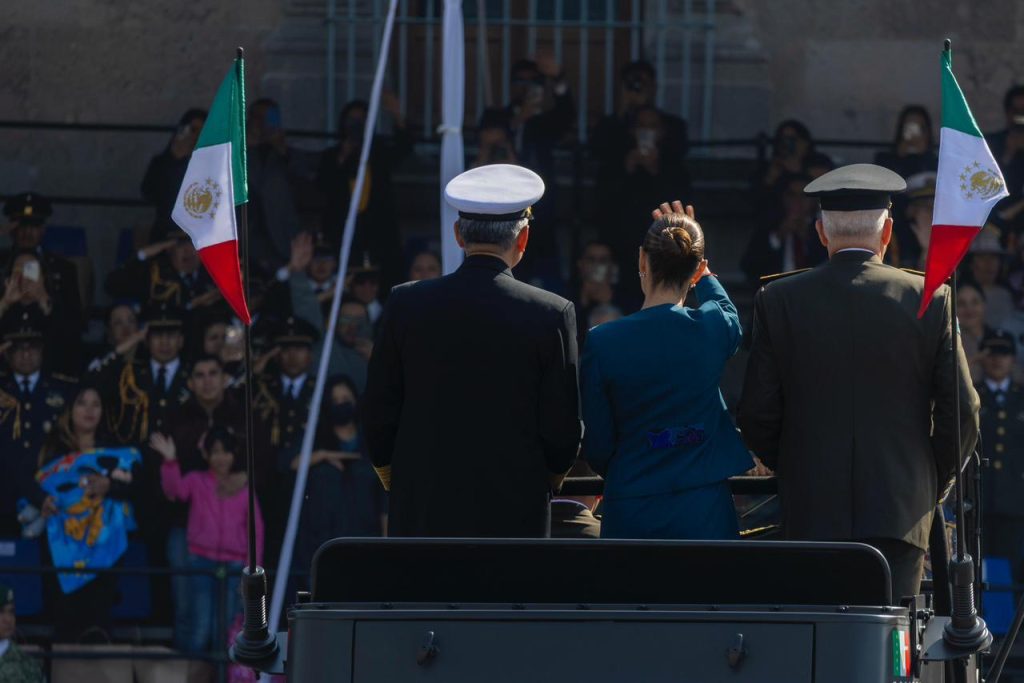La Jefa del Ejecutivo Federal, acompañada por los secretarios de la Defensa Nacional, general Ricardo Trevilla Trejo, y de Marina, el almirante Raymundo Pedro Morales Ángeles, realizó el izamiento de la bandera monumental, asimismo pasó revista a las tropas. Como parte de la conmemoración, la Presidenta presenció la declamación “Lealtad: Ayer y Hoy” a cargo de dos cadetes del Heroico Colegio Militar, la escenificación de la Revolución Mexicana a cargo de mil 910 integrantes del Ejército, Fuerza Aérea y Guardia Nacional, así como de un popurrí de bailables revolucionarios por parte del Mariachi de la Secretaría de Defensa Nacional.