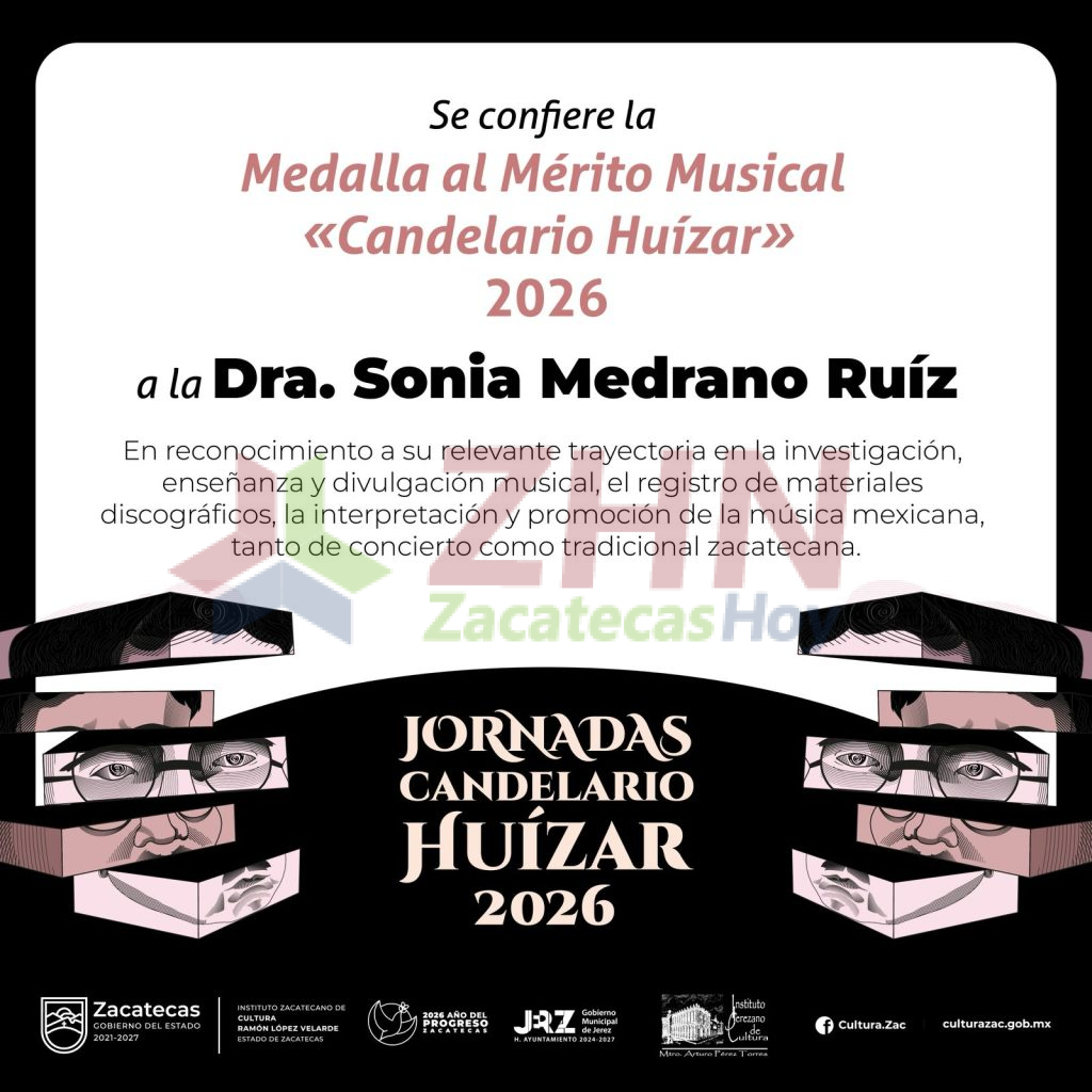 La distinción se entregará en el marco de las Jornadas Musicales Candelario Huízar, que se llevarán a cabo del 4 al 8 de mayo de 2026, en las ciudades de Zacatecas y Jerez, evento que año con año se consolida como uno de los encuentros más relevantes para la reflexión, difusión y celebración del quehacer musical en la entidad.
