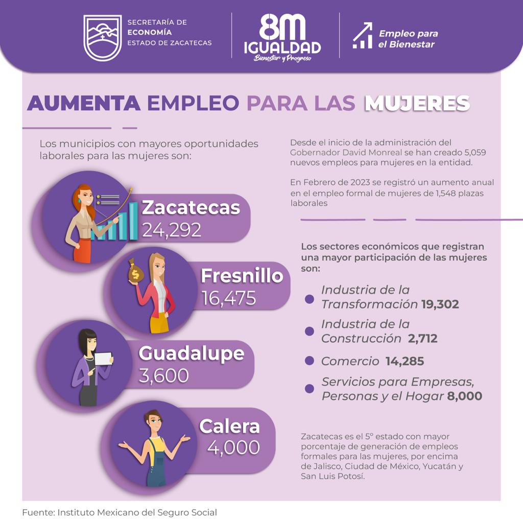 Los municipios con mayores oportunidades de empleo para las mujeres son Zacatecas, Fresnillo, Guadalupe y Calera, que en su conjunto concentran tres de cada cuatro empleos para este sector en el Estado.