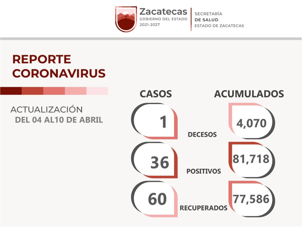 Zacatecas, Zac.- La Secretaría de Salud de Zacatecas (SSZ) informó que, en la semana del 4 al 10 de abril, contabilizaron 60 pacientes recuperados de COVID-19, a 36 nuevos casos positivos y un fallecimiento atribuido al coronavirus, en todo el territorio estatal.