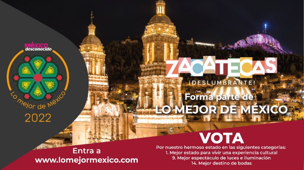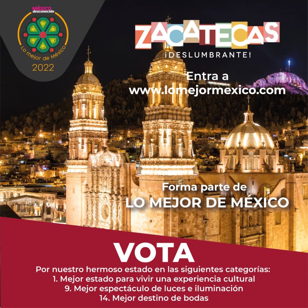 Mejor estado para vivir una experiencia cultural, mejor espectáculo de luces e iluminación y mejor destino de bodas son las tres categorías en las que participa este destino turístico, cuya actividad es uno de los ejes tractores del Gobierno encabezado por David Monreal Ávila para la reactivación económica.