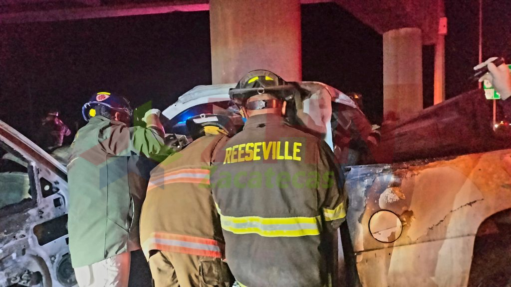 Guadalupe, Zac.- Bomberos, rescatistas y paramédicos de la Coordinación Estatal de Protección Civil (CEPC), bajo la dirección de Jorge Gallardo Álvarez y del director operativo Jesús Valadez, atendieron un llamado del Sistema de Emergencias 9-1-1 para brindar auxilio en un accidente de tránsito tipo choque contra objeto fijo con incendio, ocurrido la noche de este lunes sobre la Carretera Federal 45, a la altura del puente Osiris, en el tramo Guadalupe–Trancoso.