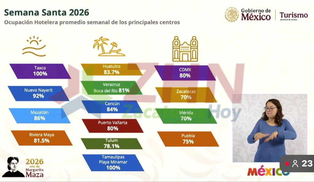 Ciudad de México.- En el marco de la conferencia “La Mañanera del Pueblo”, la secretaria de Turismo del Gobierno de México, Josefina Rodríguez Zamora, informó que Zacatecas alcanzó una ocupación hotelera del 70% durante el periodo de Semana Santa, una cifra que calificó como histórica al no registrarse en la entidad desde hace más de una década.